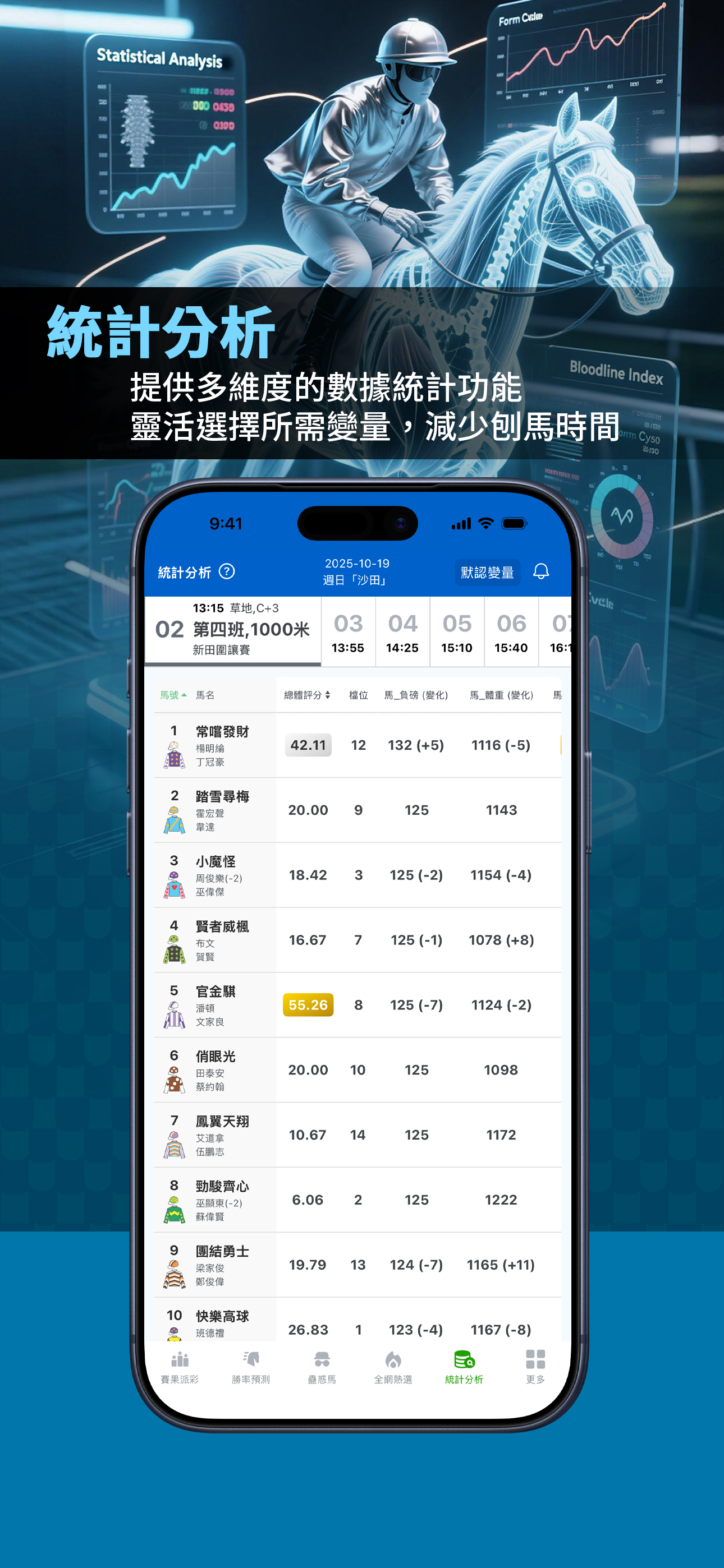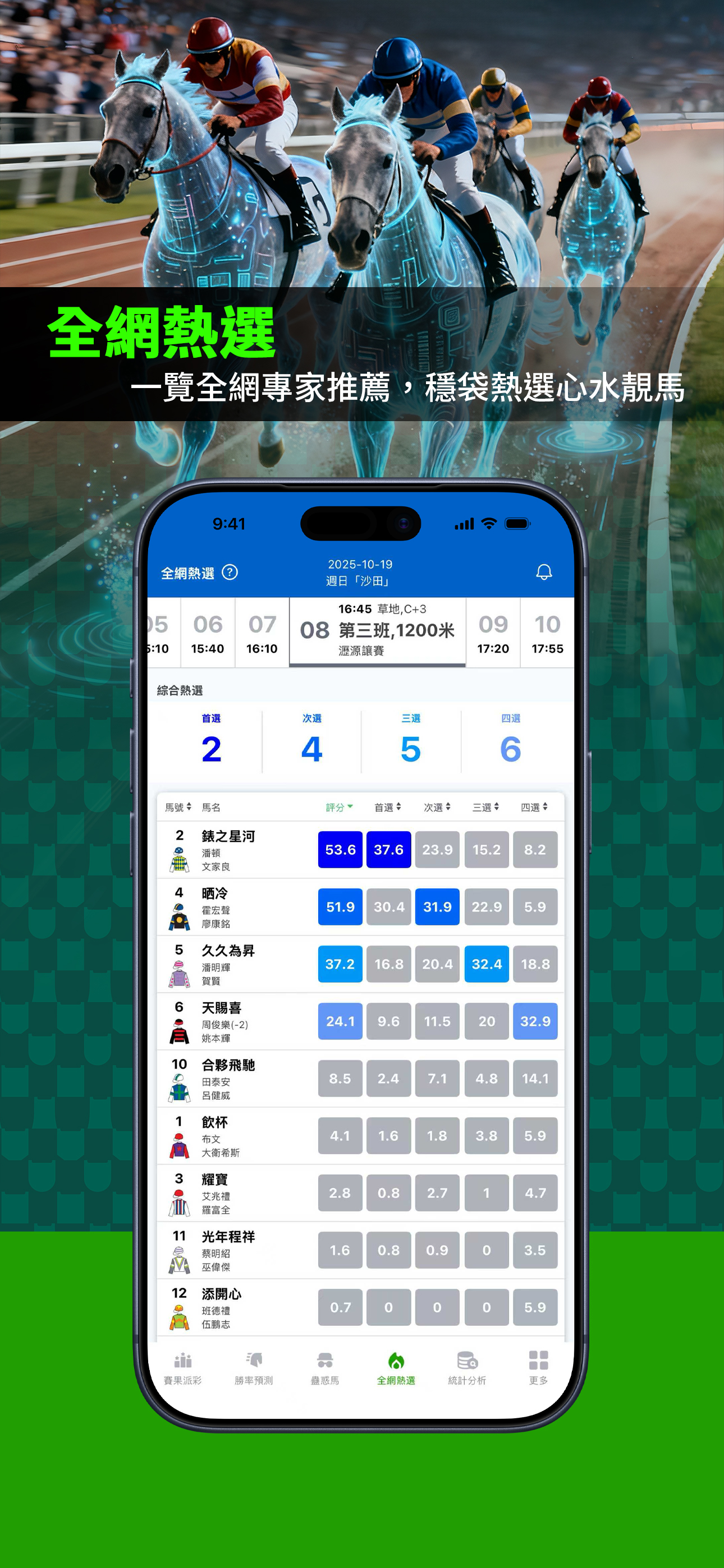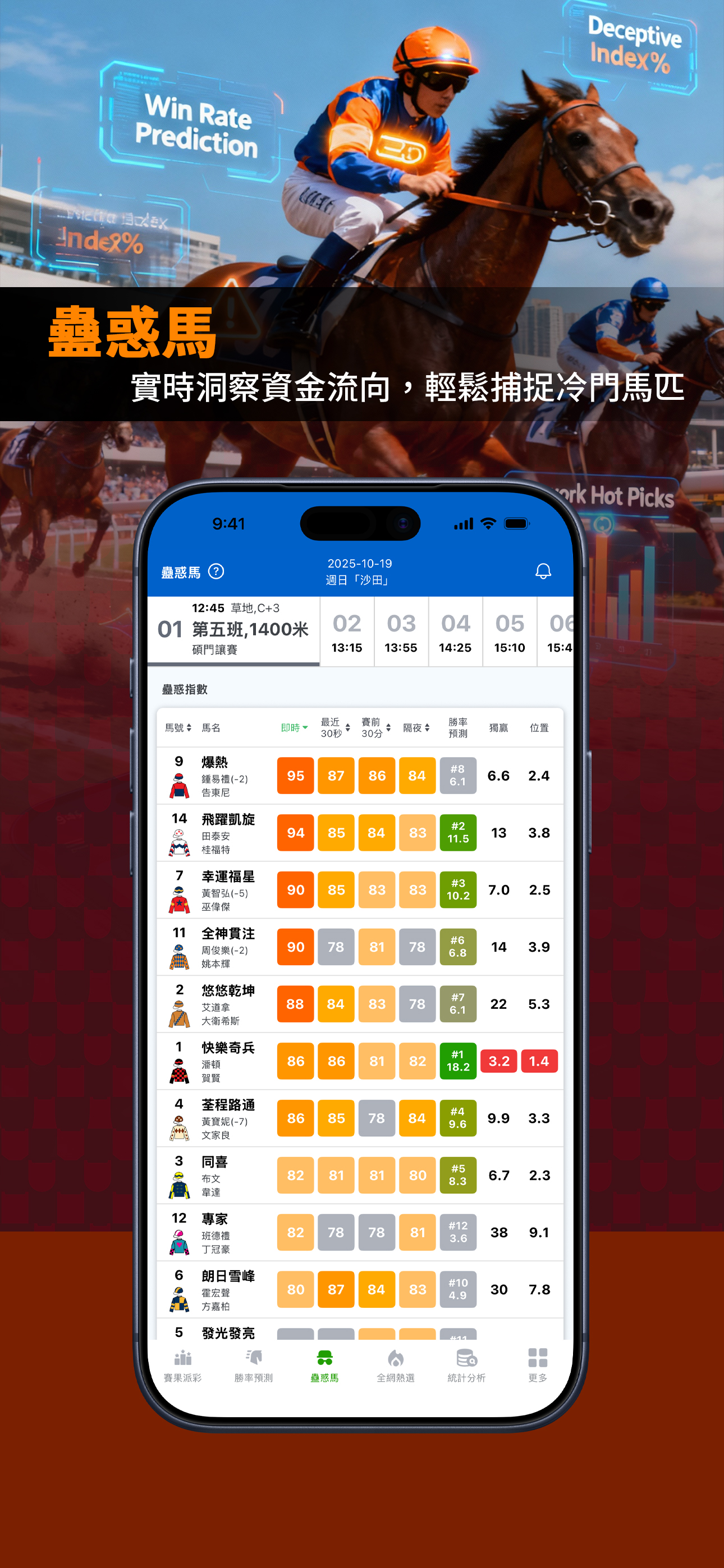 包括「自選分析」、「勝率預測」、「點買(AI策略分析)」、「蠱惑馬」、「全網熱選」綜合賽馬數據分析服務。