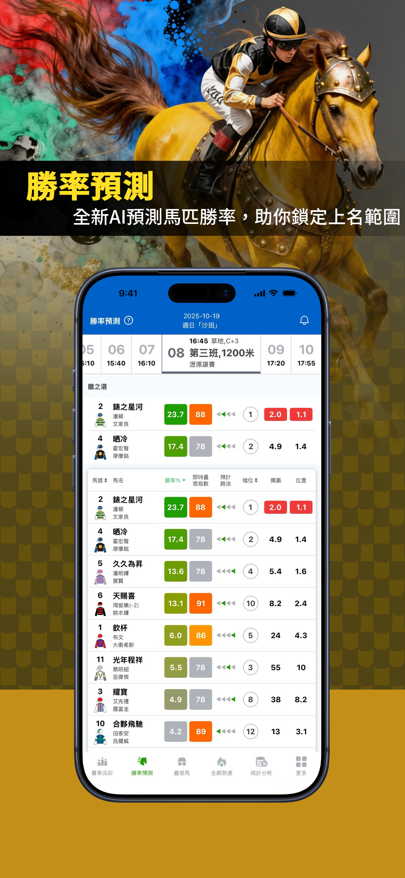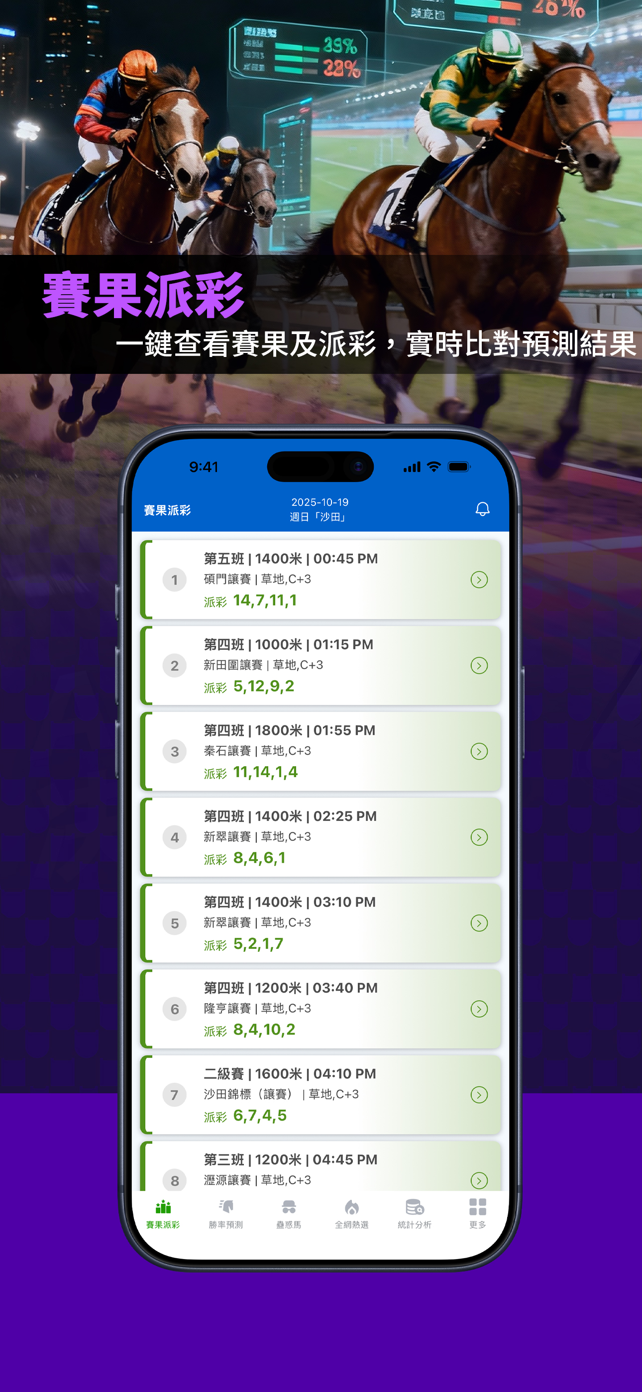 包括「自選分析」、「勝率預測」、「點買(AI策略分析)」、「蠱惑馬」、「全網熱選」綜合賽馬數據分析服務。